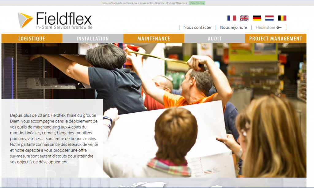 Il s’agit d’une filiale du groupe Diam International, qui propose des solutions de merchandising. La société Fieldflex s’occupe de toute la partie services au niveau mondial, pour Diam et ses concurrents : logistique, installation, intervention de maintenance et audit. Nous gérons tout le matériel que l’on peut trouver dans un point de vente : mobilier, PLV (Publicité sur Lieu de Vente)…